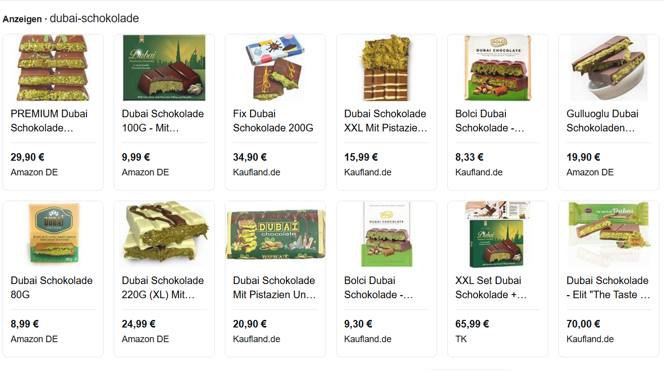 Einige deutsche Supermärkte haben Dubai-Schokolade in ihrem Sortiment, die aufgrund des großen Interesses oft vergriffen ist. Inzwischen produziert auch ein bekannter Schweizer Süßwarenhersteller eine Schokolade mit einer ähnlichen Rezeptur. So warteten in einigen Großstädten Schokoladenfans stundenlang, um eine der limitierten Tafeln für einen stattlichen Preis von rund 15 Euro zu ergattern. Auch Bäckereien, Cafés und Dessertherstellende reagieren auf den Trend und bieten „Dubai-Tiramisu“, „Dubai-Donuts“ oder „Dubai-Eiskrem“ an. Die gestiegene Nachfrage nach den Zutaten bringt den Großhandel an seine Grenzen.