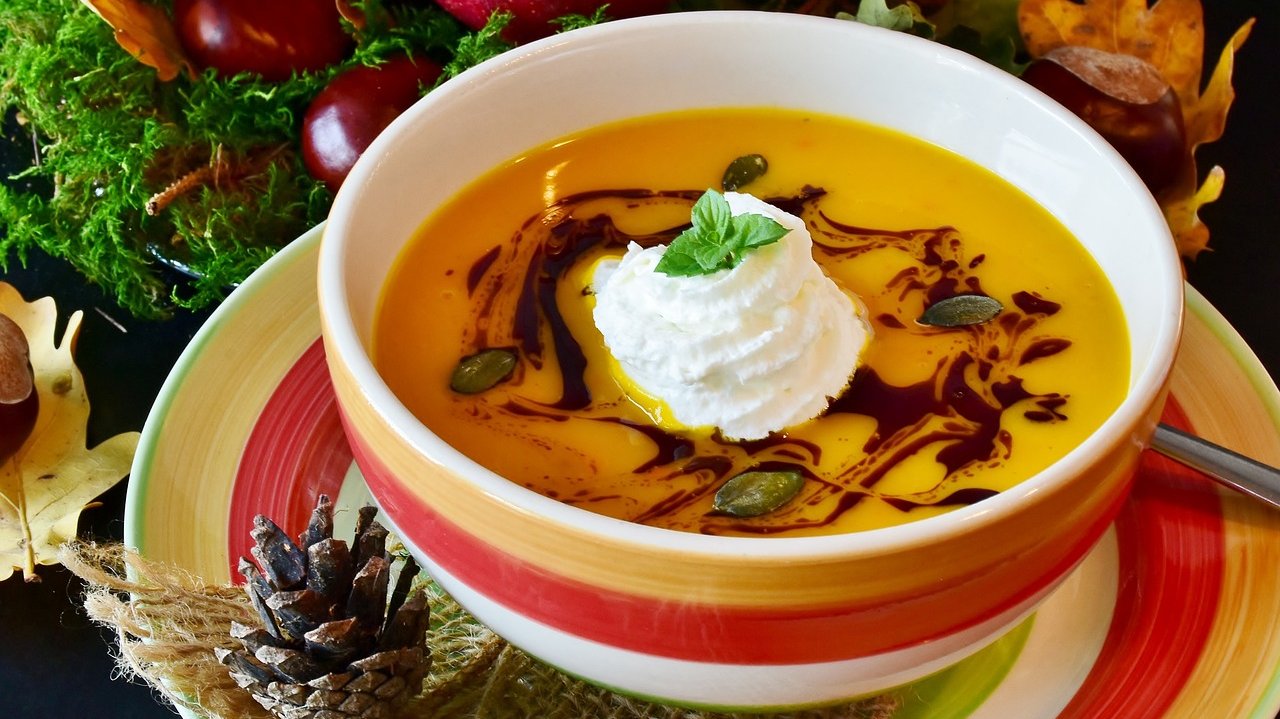 3 Lauchstangen putzen und mit einer kleinen Zwiebel fein schneiden. In 100g Butter anbraten, mit 3 EL Mehl bestäuben und verrühren. 3mehlige kleingeschnittene Kartoffeln und 3 kg gewürfeltes Kürbisfleisch dazugeben und 15 Min. schmoren. Salzen und pfeffern, mit 3 l Hühnerbrühe aufgießen und bei mittlerer Hitze eine Stunde kochen lassen. Passieren und 500 ml Sahne zugeben, noch einmal abschmecken, kurz aufkochen lassen, 100g geriebenen Parmesan unterrühren, etwas frisch geriebene Muskatnuss darüber reiben. Mit 2 Tassen gerösteten Brotwürfeln servieren. Guten Appetit.