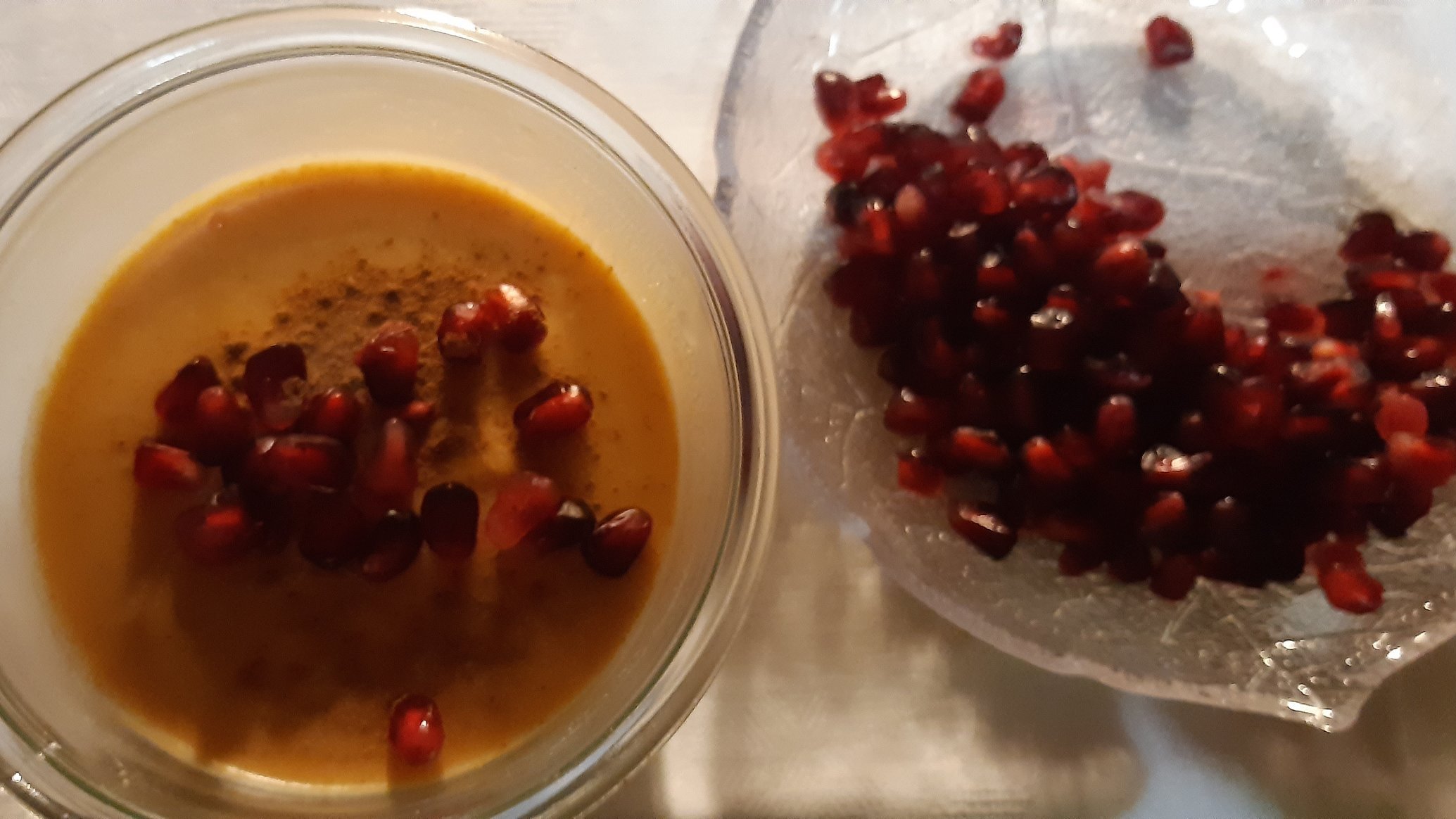 Die Süßkartoffeln halbieren, auf ein Blech mit Backpapier auf die Schnittfläche legen, mit Kartoffelgabel einstechen, ca. 45 Minuten bei 180 Grad Umluft in der Röhre garen – wenn Saft austritt noch ca. 15 Minuten! - Aus dem Ofen holen, abkühlen lassen, schälen, grob zerkleinern und in ein hohe Gefäß geben. Die restlichen Zutaten zugeben, alles pürieren, nochmals abschmecken. Jetzt ist eine recht flüssige Masse entstanden, die sich gut in Dessertgefäße abfüllen lässt und wirklich gut am Vortrag hergestellt werden kann. Ich habe Kekse auf den Grund der Dessertschalen gelegt und darauf die Masse gefüllt – und erst kurz vor dem Servieren nochmals Zimt und Granatäpfelkerne dekoriert.